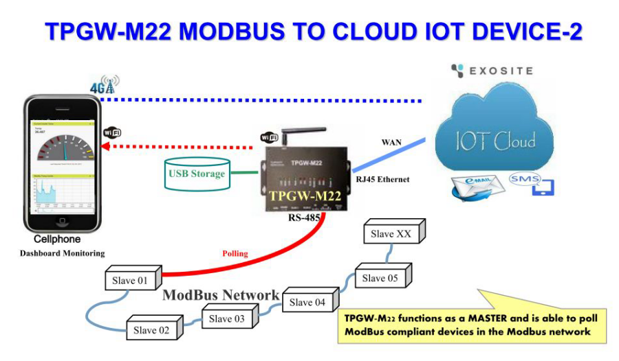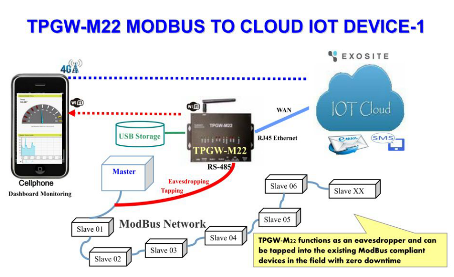 - RJ45 Ethernet to IIOT system. Parallel data feed into cloud as the ModBus network remains intact